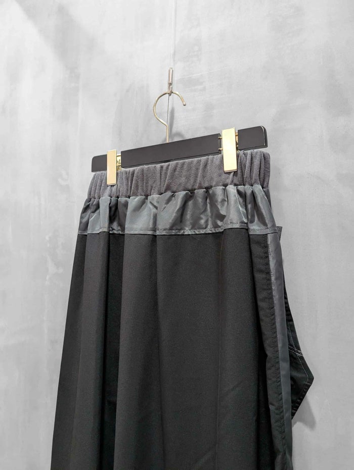 素材には、落ち感と柔らかさがありシワになりにくいTRストレッチ素材と、光沢感・撥水性・ハリコシを備えたナイロンツイル素材を使用し、それぞれの特長を活かした組み合わせに。