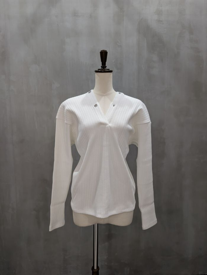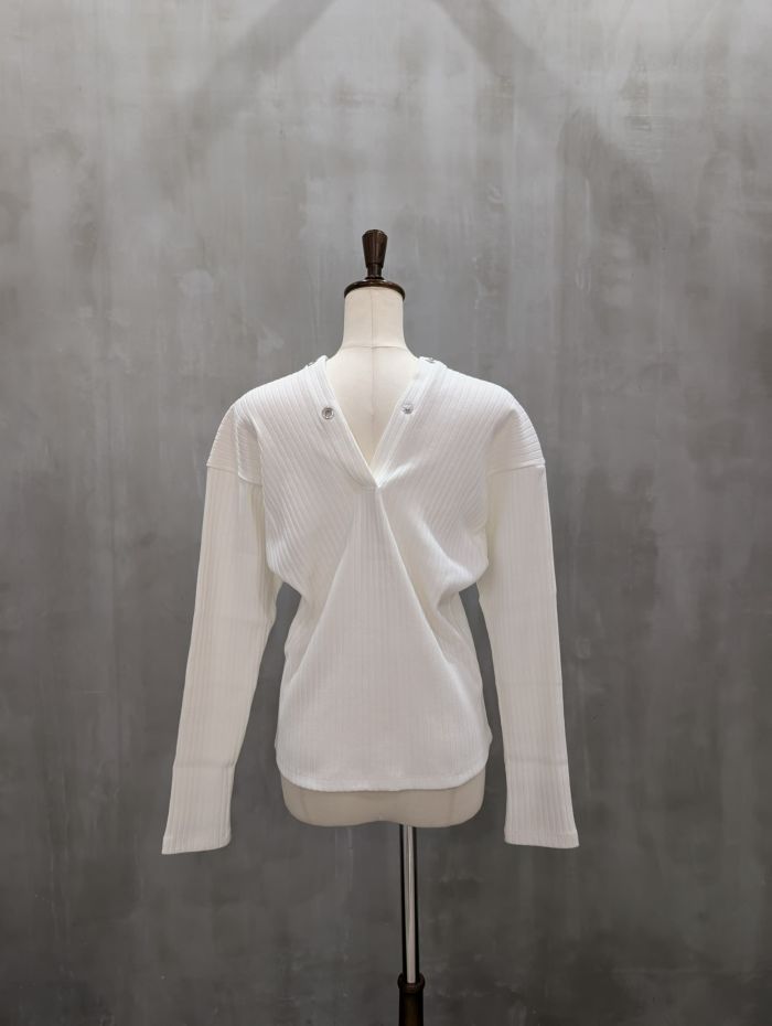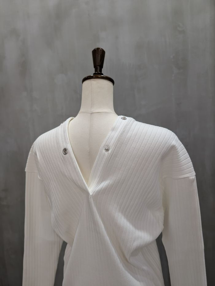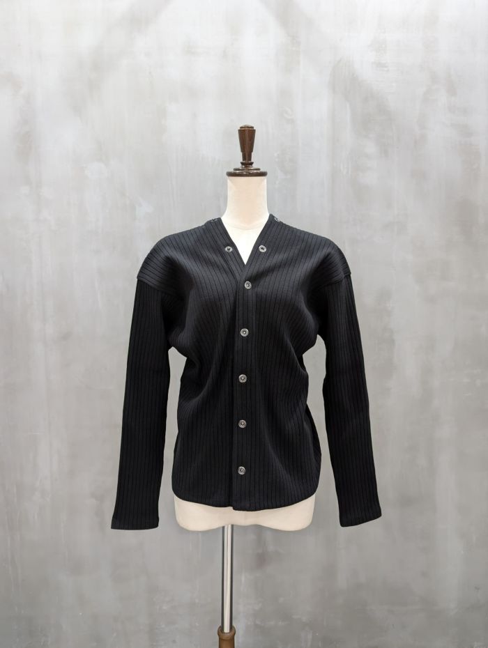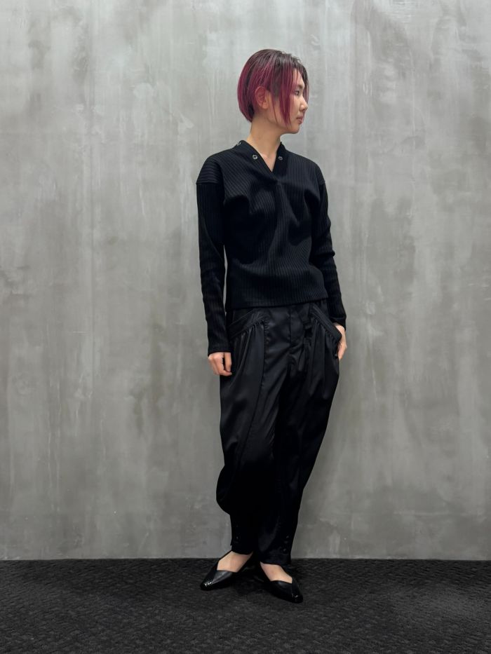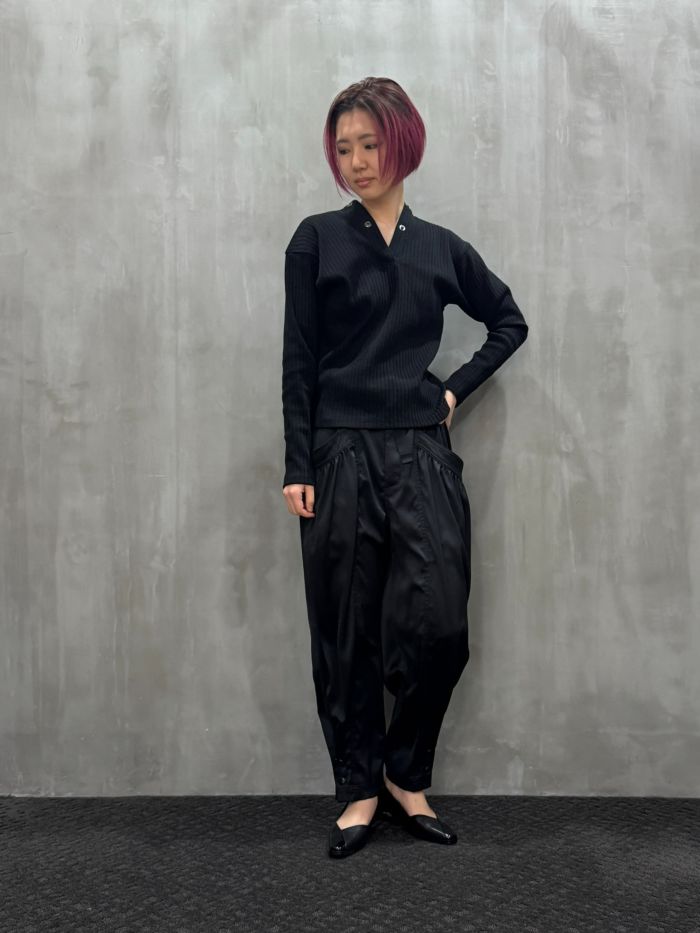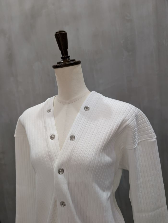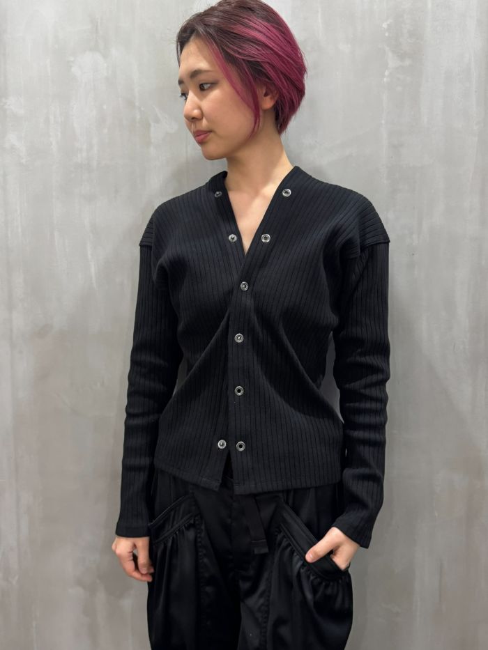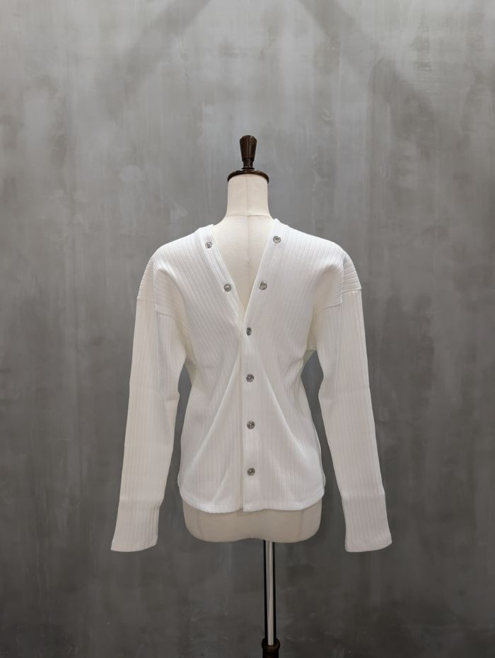 前後どちらでも着用できる2WAY仕様のカーディガンTOPは、デザイン性と機能性を兼ね備えた一枚です。地の目を活かしたVネックのカッティングがシャープな印象を与えつつ、ボリュームのある袖幅がシルエットのアクセントになり、全体のバランスを美しく演出します。
