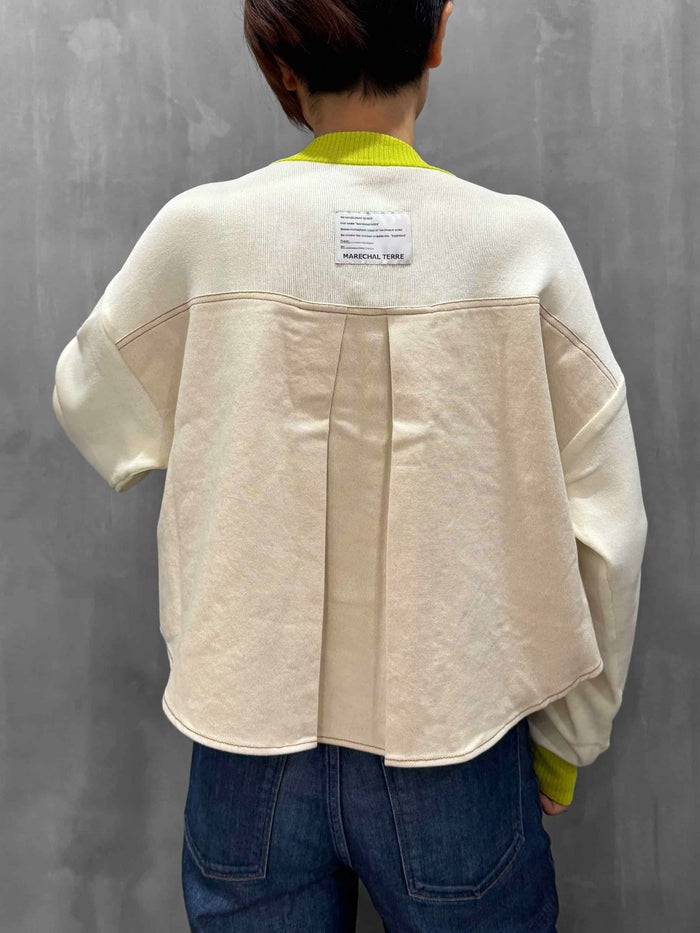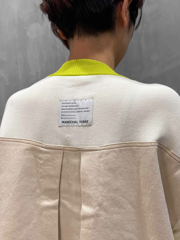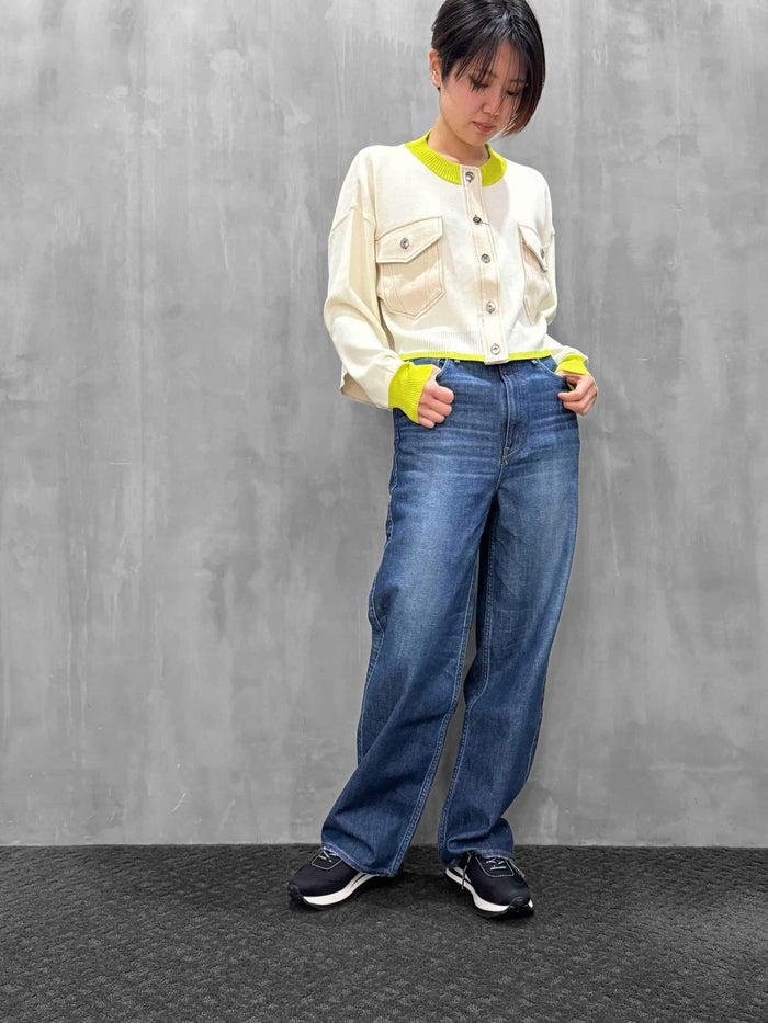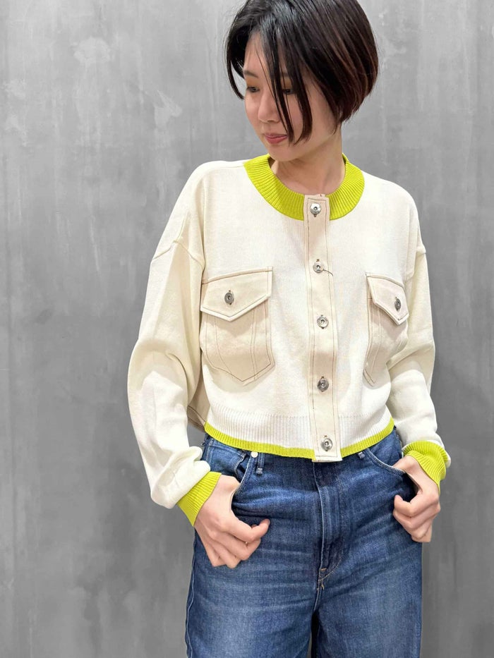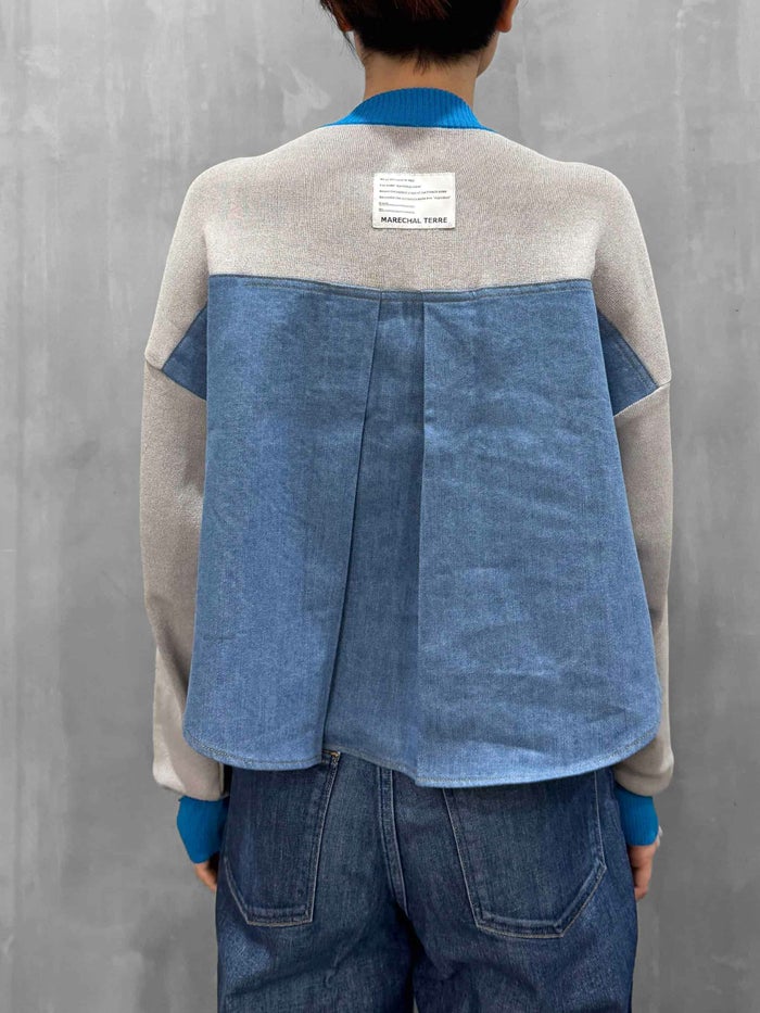 ニットとデニムを組み合わせた異素材使いが目を引く、MARECHAL TERREのショート丈ニットカーディガン。