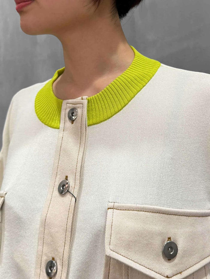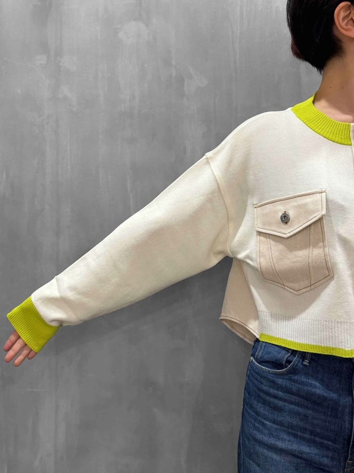 開きすぎないクルーネックと配色ラインが程よいアクセントになり、ショート丈が腰位置を高く見せ、ワイドパンツやロングスカートとも好相性です。