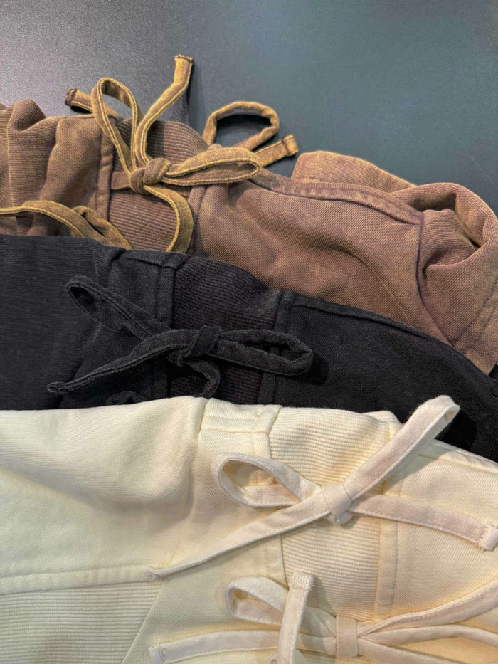 ヴィンテージ加工で可愛い印象のリボンディテールをモードに落とし込みました。