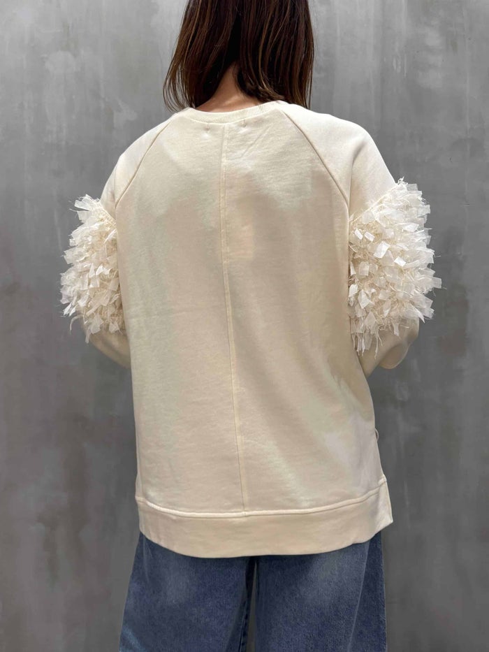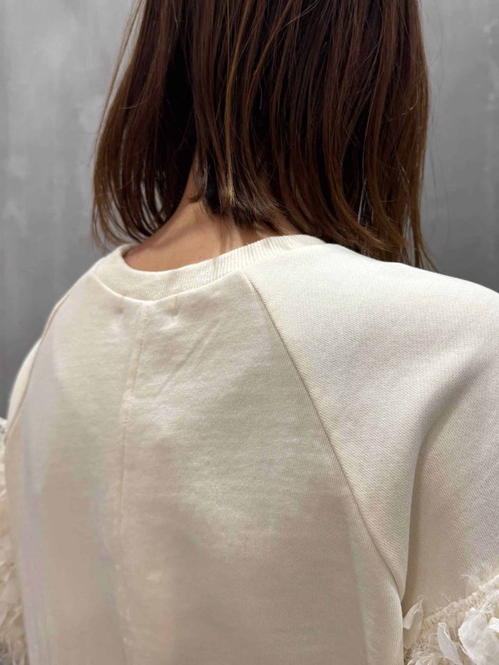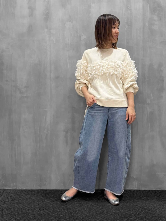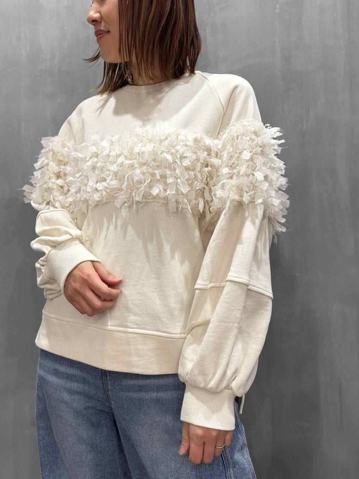 薄手のコットン裏毛プルオーバーに、シフォンフリンジレースを切り替え、存在感のあるアクセントをプラス。