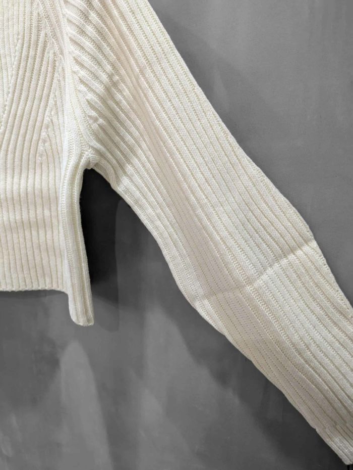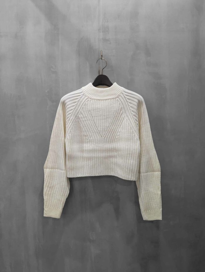 肩まわりをすっきり見せることで着膨れしにくく、自然なスタイルアップを叶えるニット。