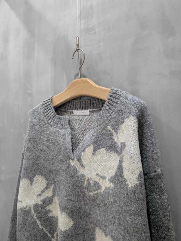 シンプルな花柄が大人しさと甘さをほどよいバランスにしてくれ、少し開いた衿元が抜け感をプラス。