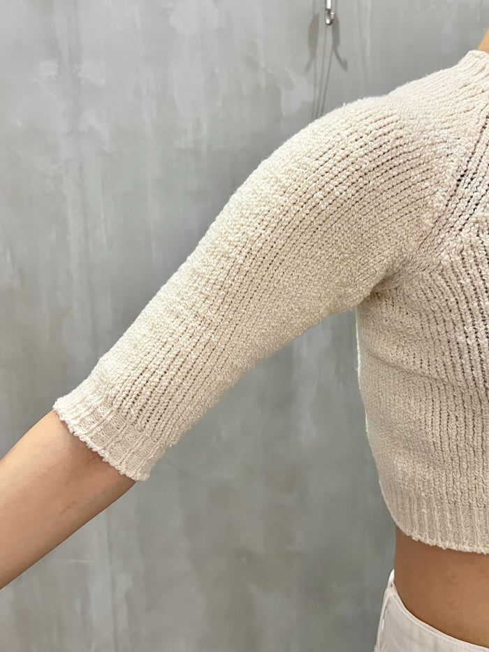 ぱっと見キッズサイズのニットですが、名前の通りの超ストレッチ素材で、苦しさを感じずに着れます。もちっとした触感で、ニット見えするのに素肌に着ても不快感0でした!