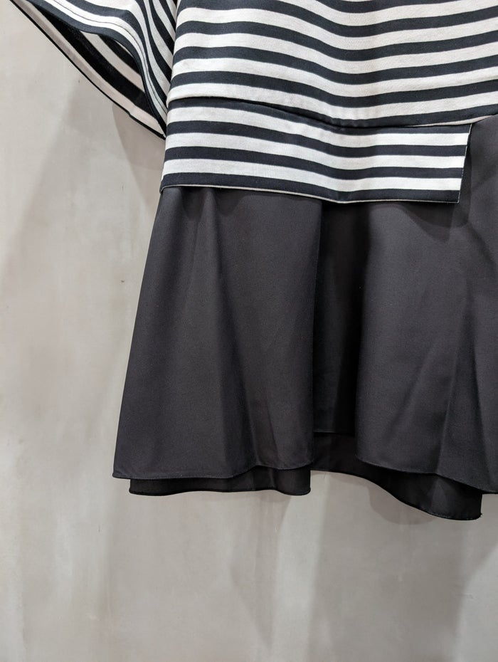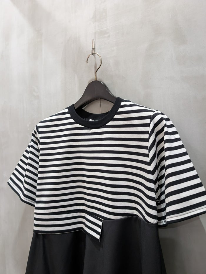 シルケット加工を施した綿100%の天竺素材をベースに、前裾と後ろ身頃をさらりとした布帛素材で切り替え、光沢感とドレープ感のある表情豊かな一着に仕上げています。特に後ろ身頃にはたっぷりとフレアを入れており、動くたびにふんわりと揺れるAラインシルエットが魅力。背中の中央にはオリジナルのロゴテープをあしらい、さりげないアクセントをプラスしています。