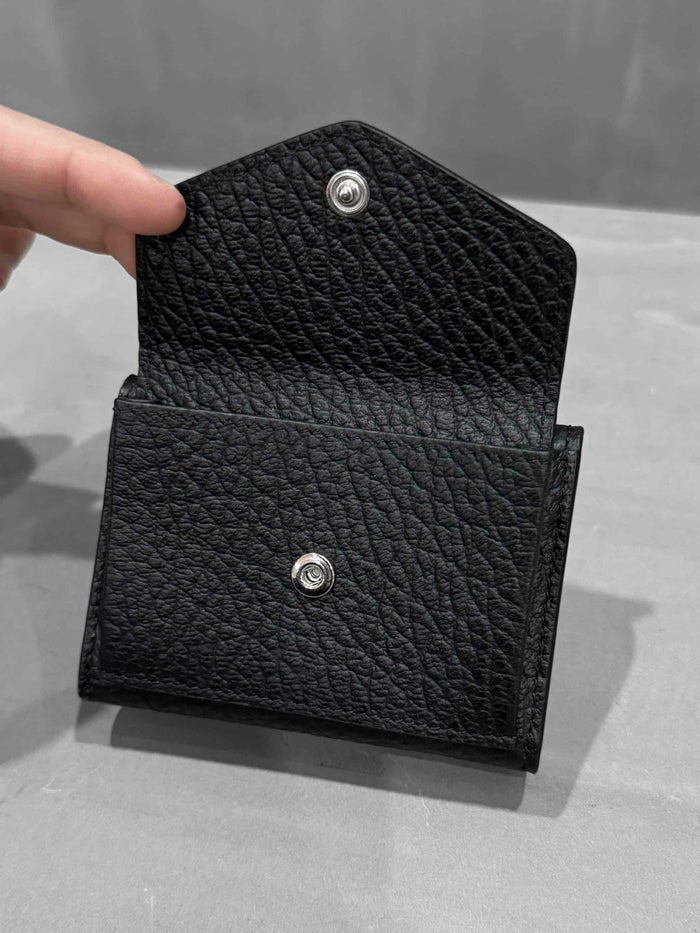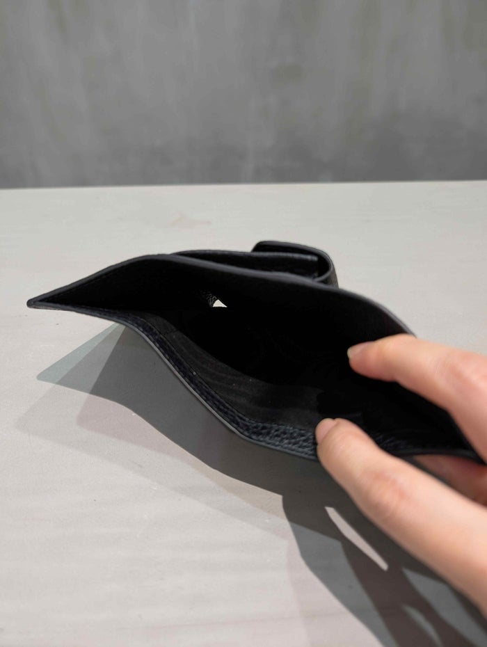 ブランドの象徴である4本ステッチを背面に施し、あえてタグを見せない“匿名性”の美学を体現。背面にはコインポケット(スナップボタン付き)を備え、コンパクトながらも実用性を兼ね備えたデザインです。内側にはスナップボタン式の開閉とカードスロットを配置し、キャッシュレス時代にぴったりのミニ財布です。