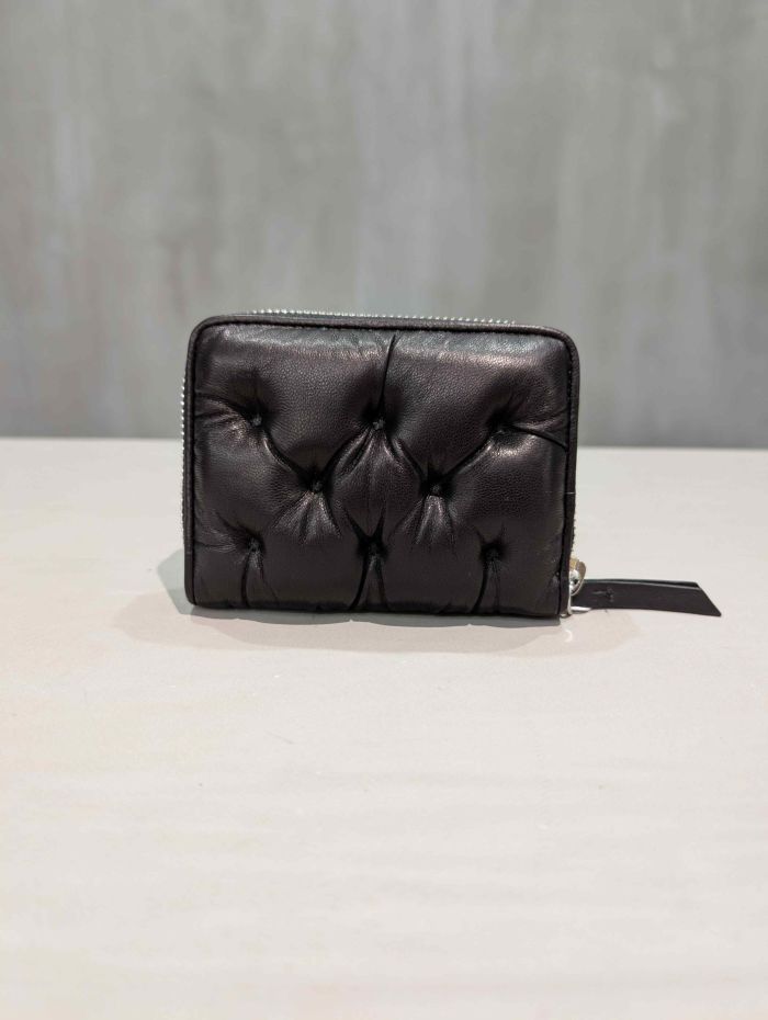 手に馴染むパフ感と、ミニマルでモードな存在感が魅力のジップアラウンド型コインケース。フロントには、ブランドを象徴するナンバリングロゴラベルを配置。さらに内側にはカーフレザーを使用し、上質な素材感と耐久性を兼ね備えています。