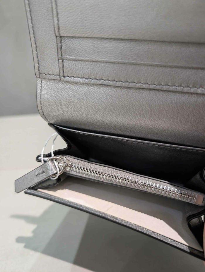 外側はシンプルで洗練された佇まいながら、内側にはシルバーカラーのレザーを採用し、開いた瞬間にブランドらしいコントラストと遊び心を感じさせます。