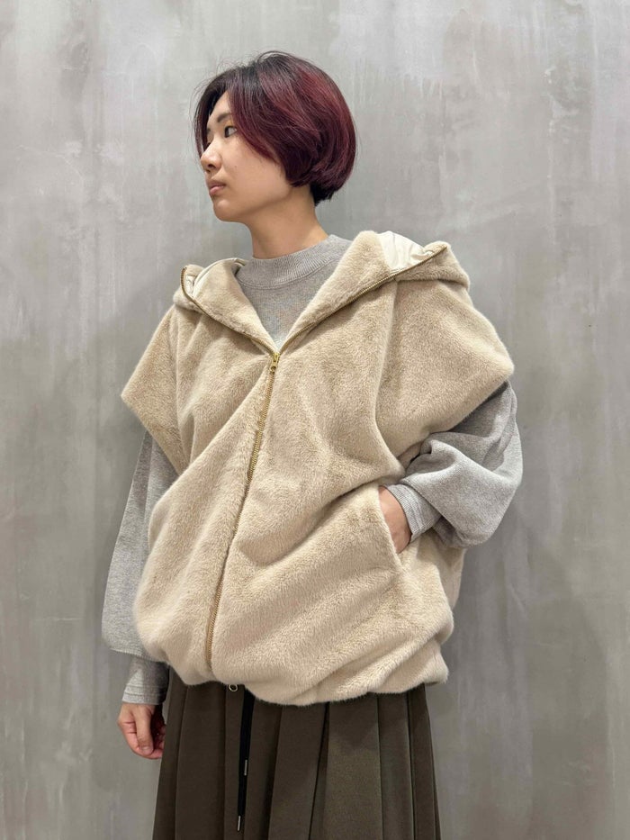 上品なミンクファーを思わせるフェイクファー素材を使用したフーディーベスト。ふんわりとした毛足が高級感を演出し、羽織るだけでスタイリングに存在感を与えてくれるアイテムです。