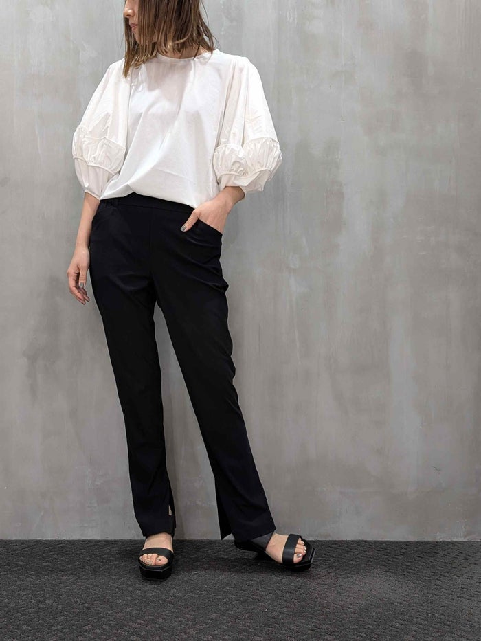 きれいめなブラウスやシャツに合わせてシックに、カジュアルなカットソーと合わせてヘルシーに、様々な着こなしに合わせやすい万能パンツです。
