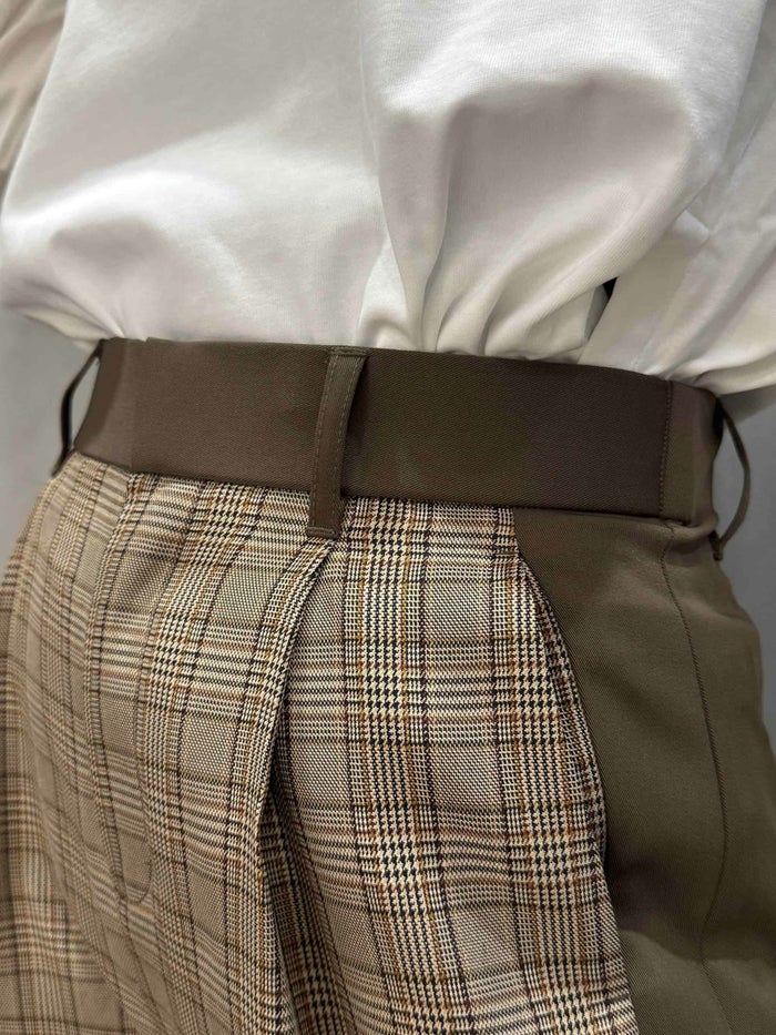CEaRETらしい遊び心が光るこのパンツは、異素材のドッキングデザインが目を引く主役級ボトム。クラシカルなチェックモカとストライプグレーの2カラーは、それぞれ異なる雰囲気を演出し、スタイリングに奥行きを与えてくれます。ワイドながらも直線的なシルエットで、落ち感のある素材がきれいな縦ラインを作り出し、スタイルアップ効果も期待できる一本です。