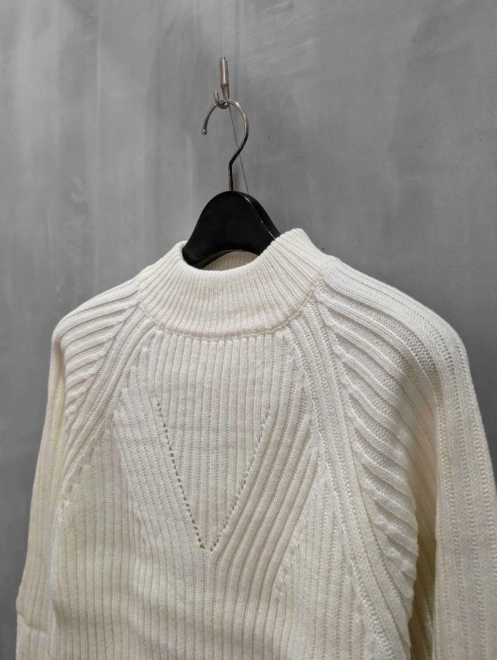 肩まわりをすっきり見せることで着膨れしにくく、自然なスタイルアップを叶えるニット。