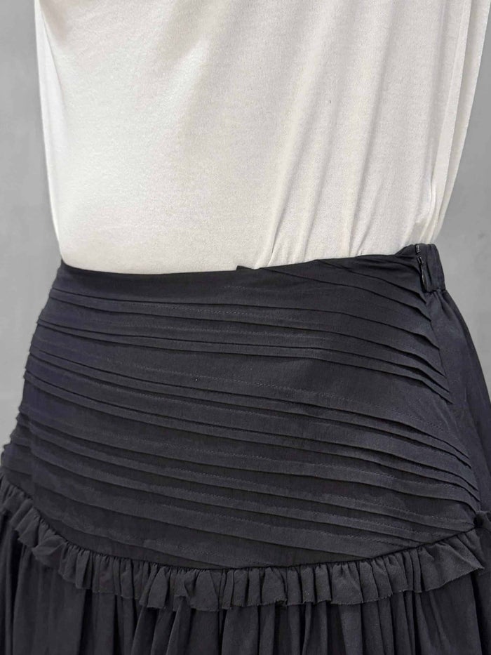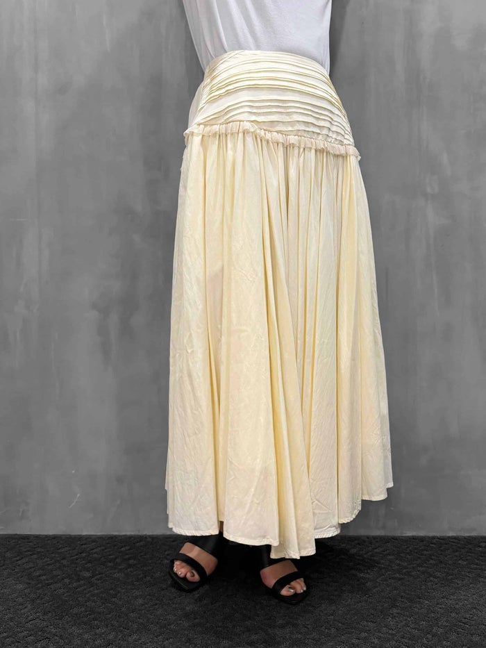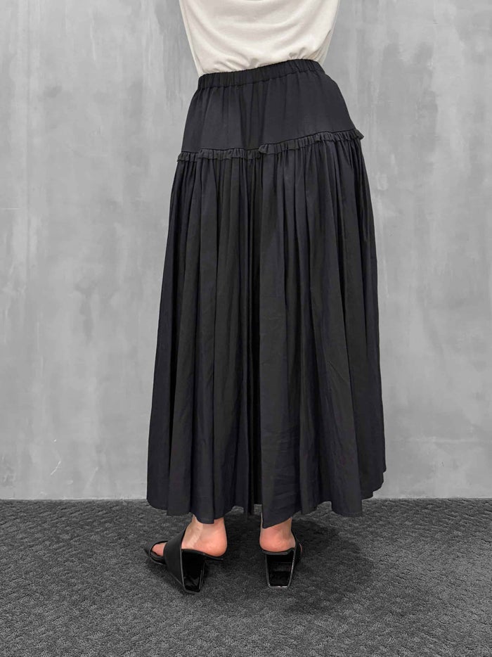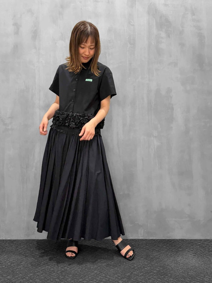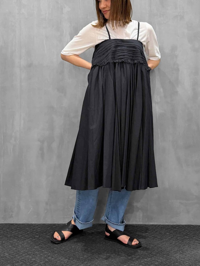 吊り紐の付いたスカートです。初めてのデザイン。ヒップハングでやや大きめのウエストになっています。ウエストから腰まで切り替えが付いていて、ランダムにタックを寄せたデザイン。その下に小さいフリルを付けています。そしてこのギャザーがとても特徴的です。細かくたっぷりとギャザーを寄せて大きな蹴回しになっています。フロントのギャザーがたっぷりしていて、裾がランダムになっているのも魅力です。実物はリッチなギャザーのドレープが見事で歩く度に揺れる雰囲気がとても素敵です。両サイドポケット付き。ウエストから紐を付けており吊りスカートにも出来るようになっています。今回後ろで結ぶタイプの紐がクロスになるように付いていて、長さ調節が可能で胸まで引き上げてビスチェ風ドレスにすることも出来るようになっています。2WAYでドレスとして着用できるのも魅力ではないかと思います。ここまでギャザーが入っているスカートも少ないと思うので、少しプライスが上がってしまいましたが、とても魅力あるスカートが出来たのではないかと思っています。ブラックが万能でお勧め。クリームはバター色で合わせやすくこちらも夏にはとてもかわいいカラーだと感じます。吊り紐でビスチェ風のドレスにした時のスカート丈も可愛いなと思いました。
