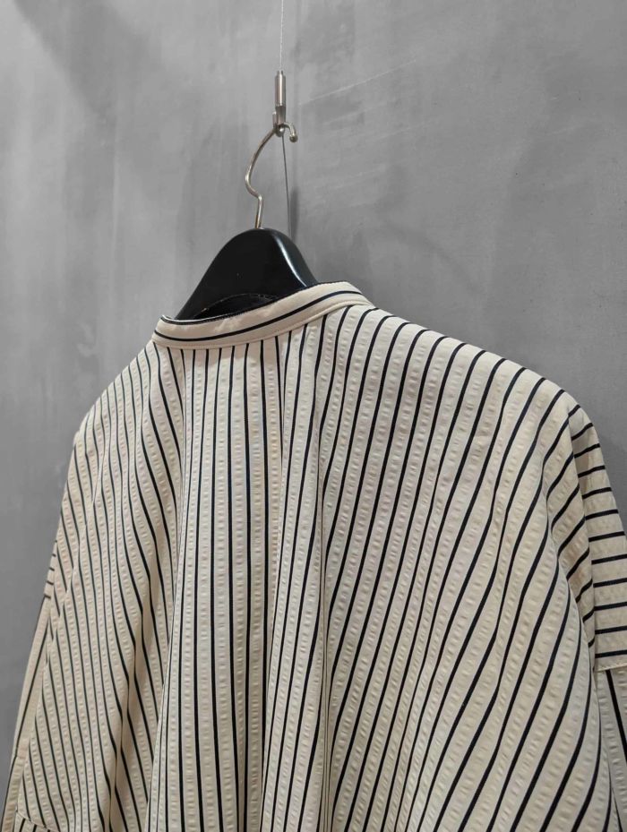 見た目の凹凸感とハリのある風合いが特徴で、異なるストライプ柄をドッキングしたデザイン。