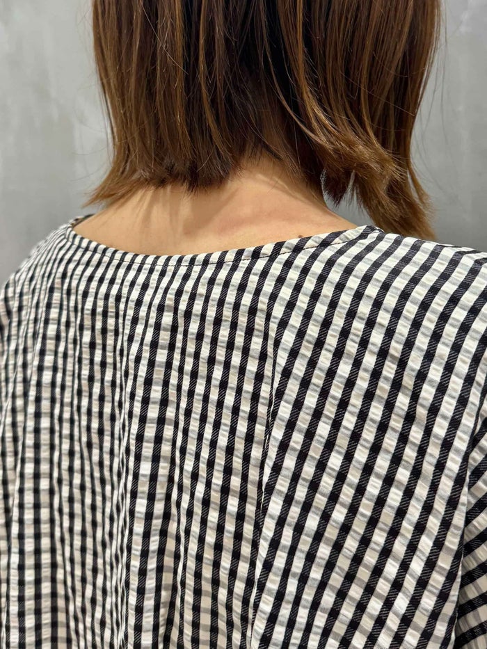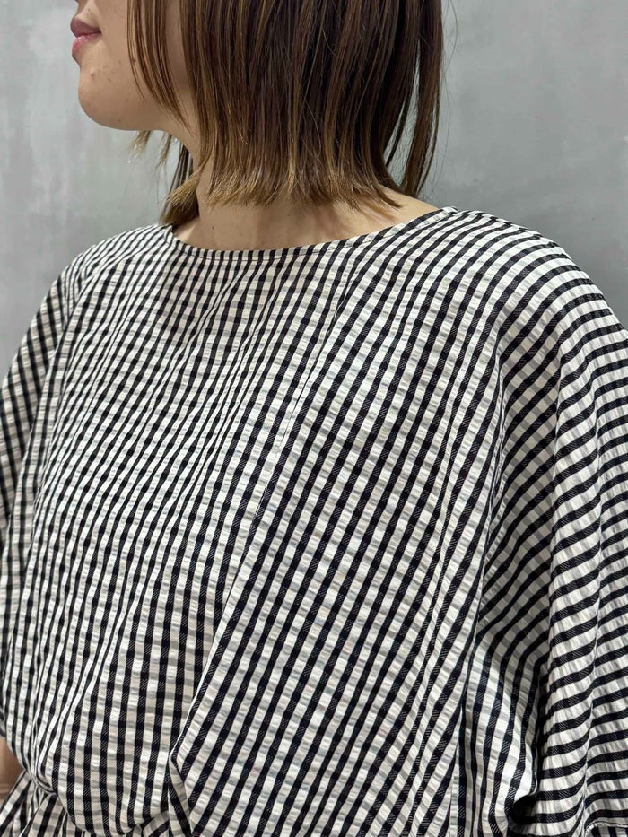 ぐっと短めな丈感と、ボリュームのあるシルエットのデザインブラウス。素材には、ポリエステルレーヨンの先染めチェックを使用。レーヨンの光沢感とギンガムチェックの凹凸感が特徴です。バルーン仕様のボリュームあるブラウスは、ご家庭でのイージーケアも可能で、インナー裏地や、アジャストで調節可能なウエストゴムギャザーなど、裏側の仕様に拘ることで、安定したシルエットでストレスなくご着用頂けるアイテムです。同素材で展開のタックギャザーカーブパンツとのセットアップ合わせもおすすめです。