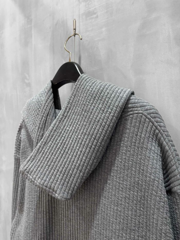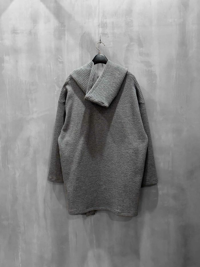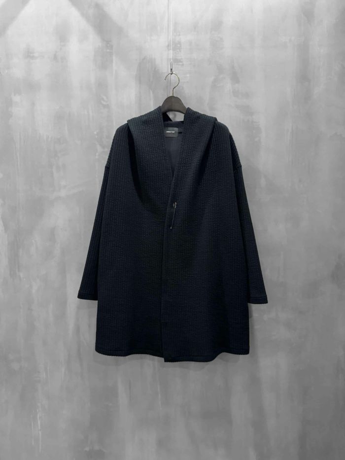 身頃続きのフードがポイントで、膝上短め丈のガウンです。