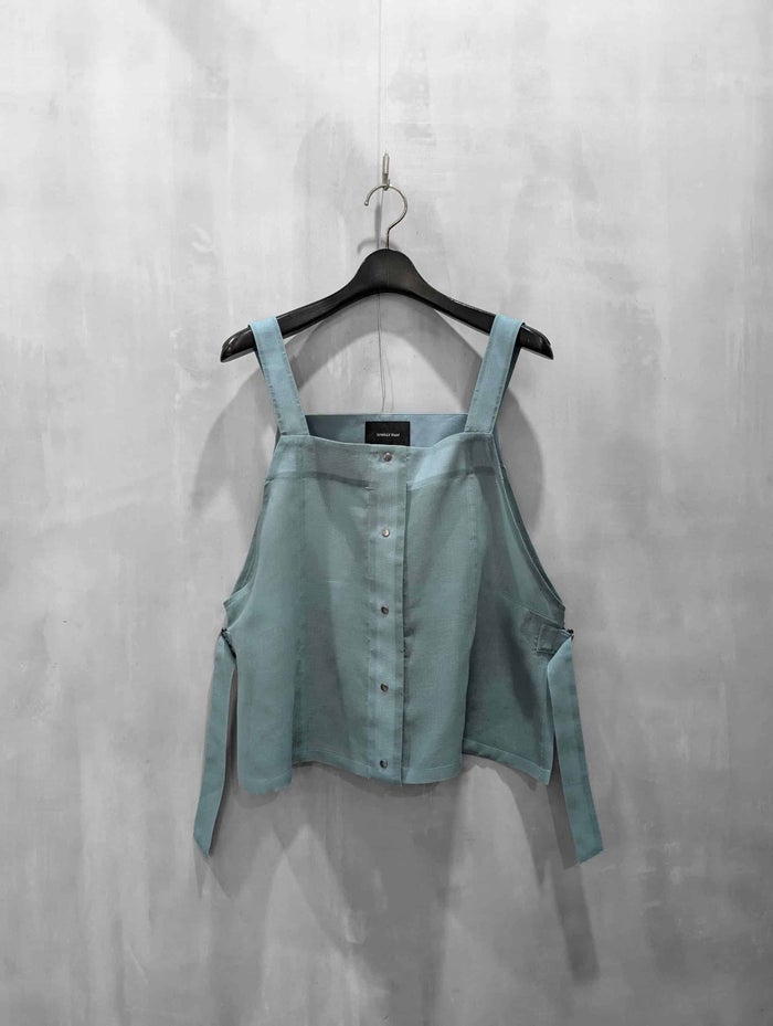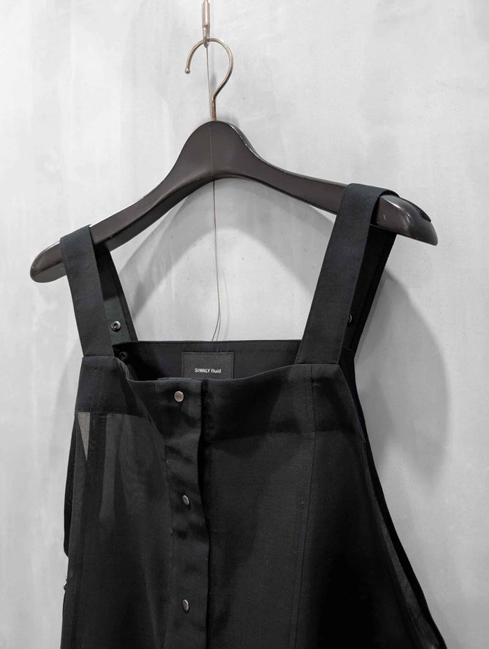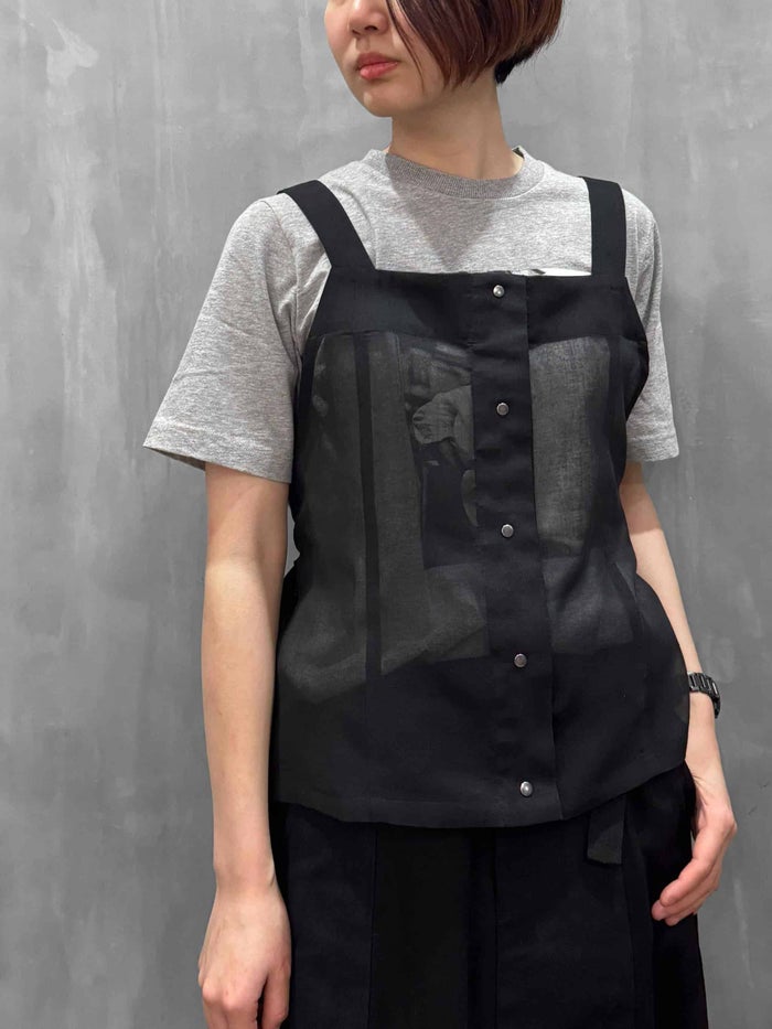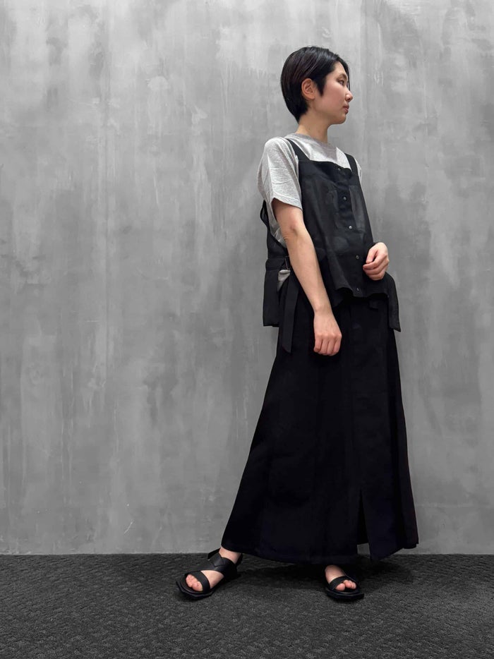 ワイドシルエットのワークベストはそのままカジュアルに着用するのはもちろん、バックウエストのベルトを引っ張り縮めることで、ビスチェのようにも着用して頂ける2wayアイテムです。