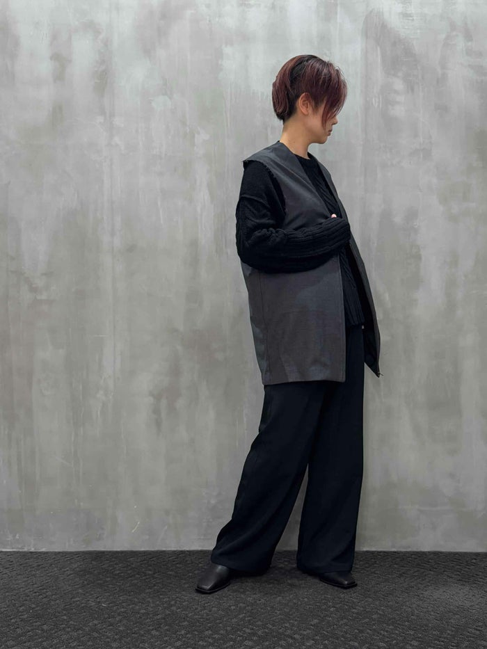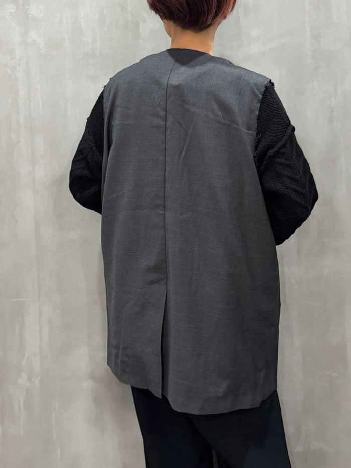上質なウール100%素材を贅沢に使用した、洗練された印象のノースリーブベスト。薄手ながらしなやかなハリと美しいドレープ感を備え、オールシーズン活躍するアイテムです。袖口は断ち切り仕様で、さりげない抜け感をプラス。フロントにはミニマルなシームポケットを配し、ディテールまでスマートな仕上がりに。インナーを選ばず重ね着がしやすいボクシーなシルエットで、シャツやリブニットとのレイヤードにも好相性。セットアップ風に同素材のパンツとの合わせもおすすめです。