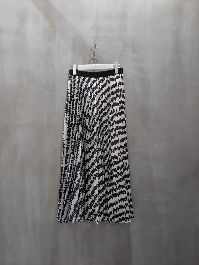 独特な柄とエレガントなシルエットのスカート。プリーツ加工で動きのあるデザインが目を引き、上品で女性らしい印象を演出してくれます。