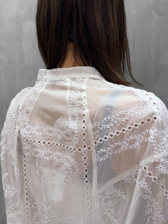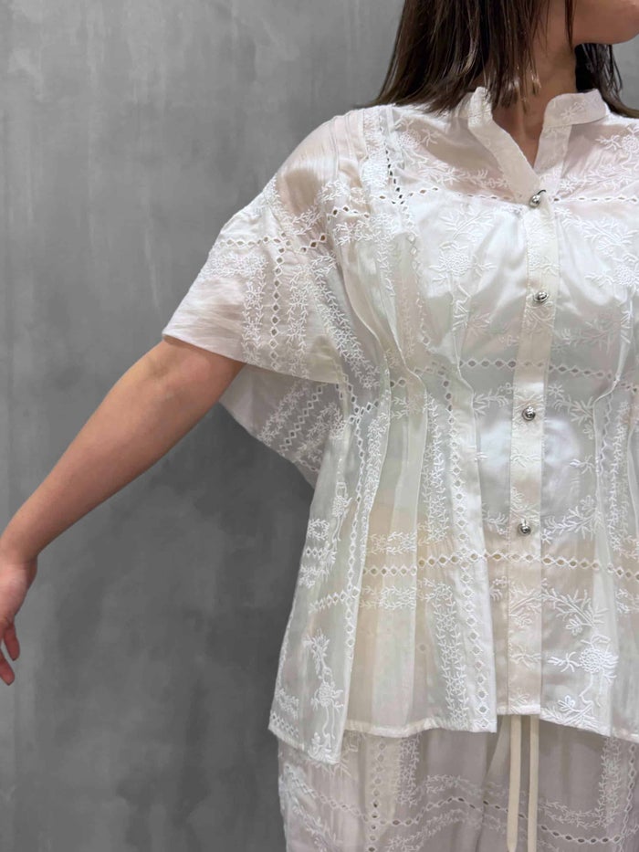 インポートの繊細な刺繍が光るケミカルレースを使用したシリーズアイテム。 ブラウスはエアリーな透け感が軽やかな印象で、光にあたると細やかな花刺繍が浮かび上がる、上品で華やかな一枚。