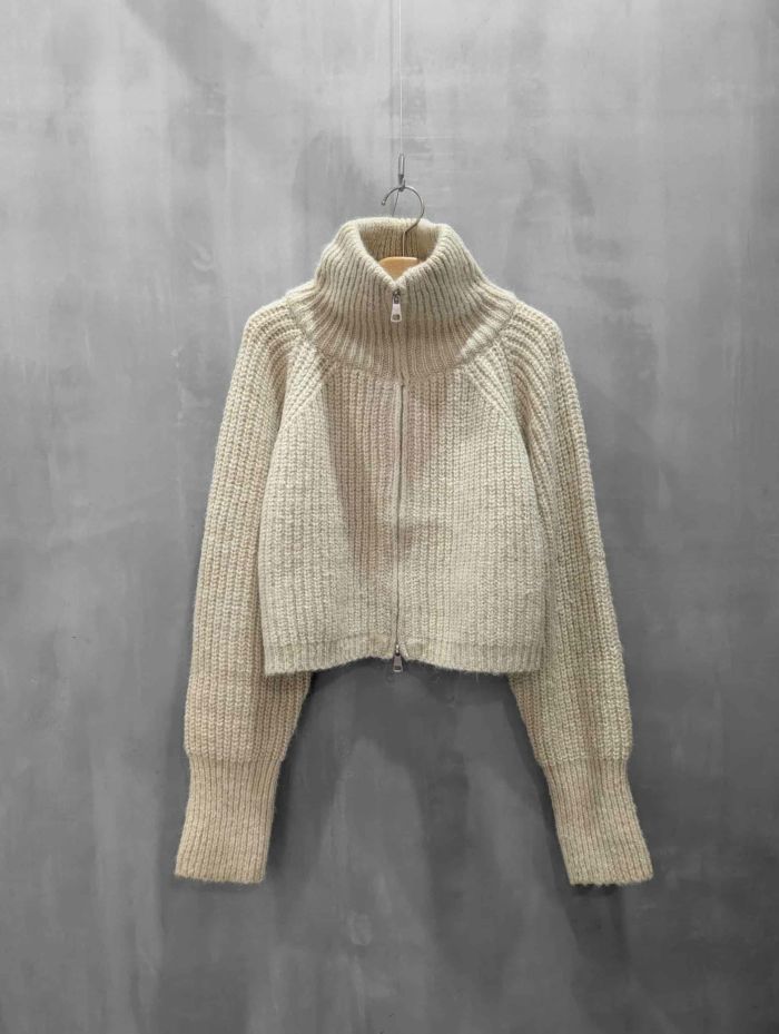 ・首元まで覆うハイネックで季節感と防寒性を両立。