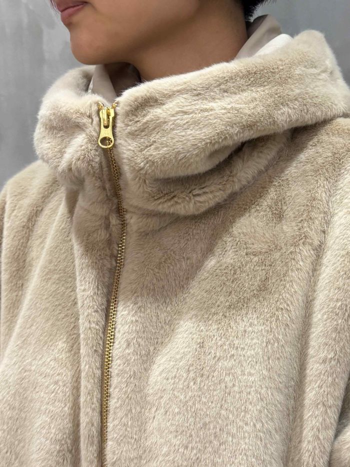 上品なミンクファーを思わせるフェイクファー素材を使用したフーディーベスト。ふんわりとした毛足が高級感を演出し、羽織るだけでスタイリングに存在感を与えてくれるアイテムです。
