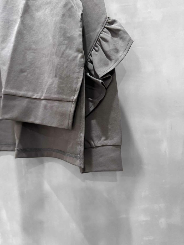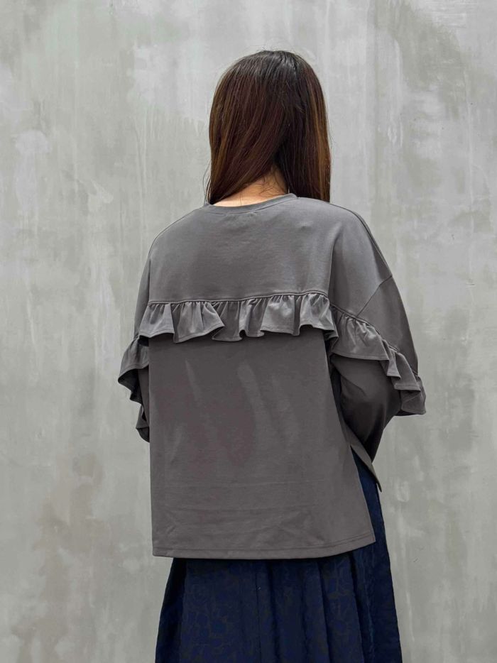 袖先から背中のギャザーフリルや前後差のある着丈など1枚で映えるカットソーです。