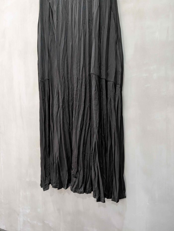 全体に施されたクラッシュプリーツが生み出すランダムな立体感は、カジュアルながらも印象的な表情を演出。裾にかけて広がるボリュームのあるシルエットが、動くたびに揺れて女性らしい華やかさを引き立ててくれます。