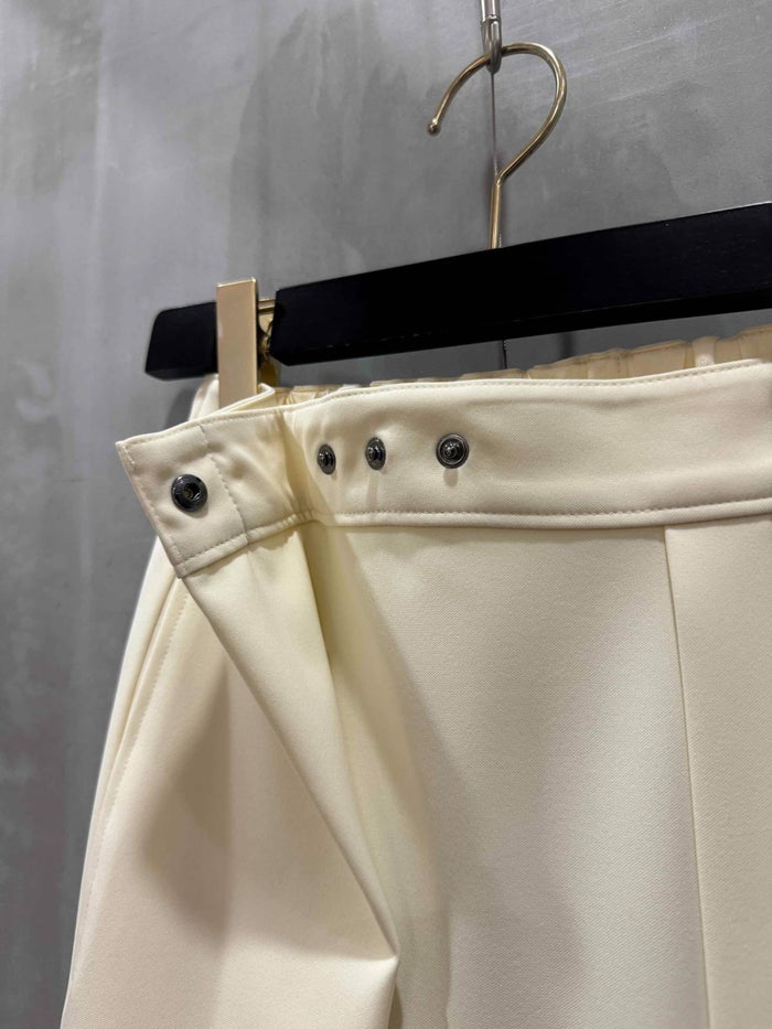 3段階のドット釦によりウエストをサイズ調節でき、バックウエストはゴム仕様なので、ハイウエストでもローウエストでも着用していただけます。