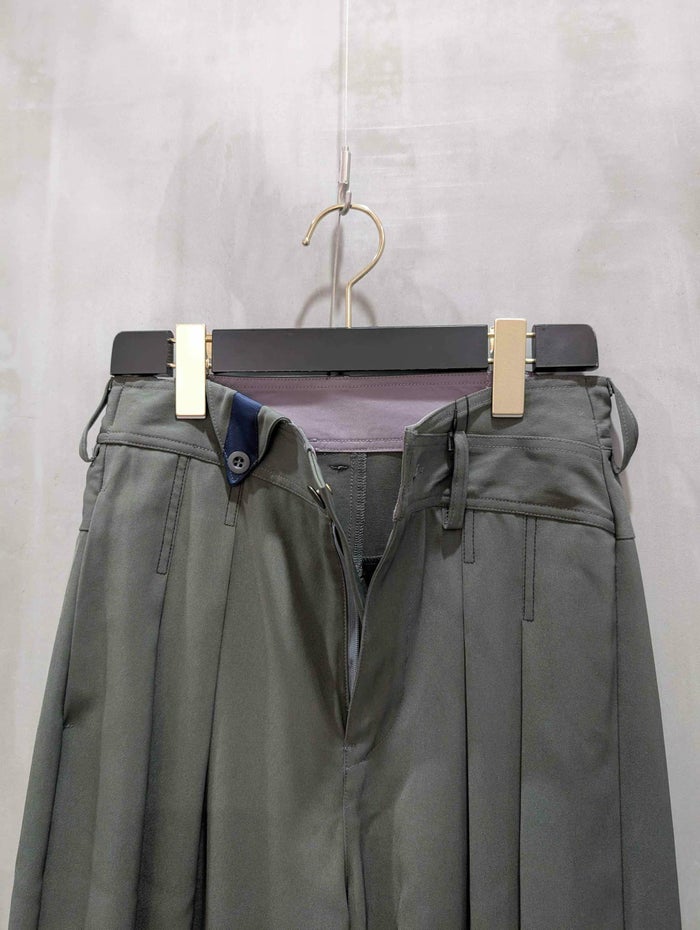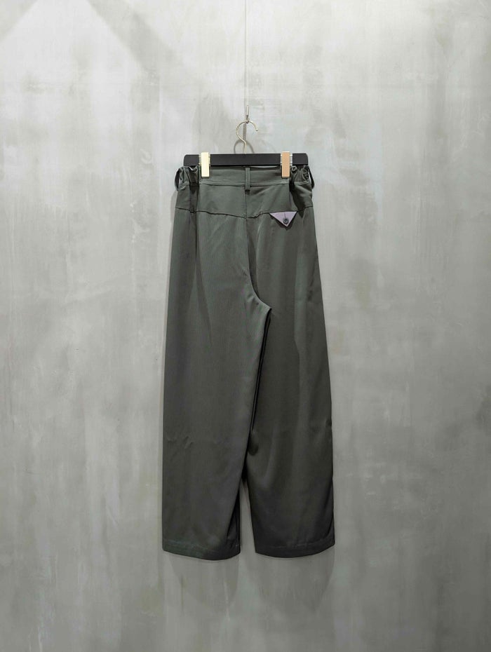 コクーン風のシルエットながら、カーブを抑えたバランス感のあるデザインで、体のラインを拾わずスッキリとした印象に。フロントのタックにはさりげない配色ステッチが施され、ディテールにまでこだわりを感じさせます。ウエストはベルト仕様で両サイドにゴムが入り、ラクな穿き心地ときちんと感を両立。右ベルトループには配色のグログランテープをあしらい、アクセントをプラスしています。